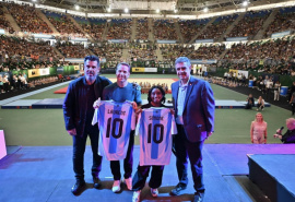 En un escenario imponente y ante más de 10 mil personas, dio una clínica gratuita en el Estadio Mary Terán de Weiss, en el Parque Roca. Fue una gran fiesta para los chicos y sus familias, con entradas agotadas.